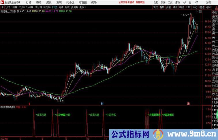 RSV庄:=(((CLOSE - LLV(LOW,9)) / (HHV(HIGH,9) - LLV(LOW,9))) * 100); K庄:=SMA(RSV庄,3,1); D庄:=SMA(K庄,3,1); J庄:=3*K庄-2*D庄; X庄:=LLV(J庄,2)=LLV(J庄,8); AA庄:CROSS(J庄,REF(J庄+0.01,1)) AND X庄 AND J庄< 19,COLORRED; DRAWTEXT (AA庄,0.8,'--->庄家抄底'),COLORGREEN;