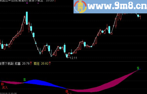 若狂:MEMA(MEMA((((C-O)*2)+O),5),13); DRAWBAND(欣喜,RGB(150,0,80),若狂,RGB(0,0,250)); DRAWICON(LONGCROSS(欣喜,若狂,1),欣喜*0.958,7),COLORRED; DRAWICON(LONGCROSS(若狂,欣喜,1),若狂*1.03,8),COLORGREEN; DRAWTEXT(LONGCROSS(欣喜,若狂,1),欣喜*0.9165, 买入 ),COLORRED;