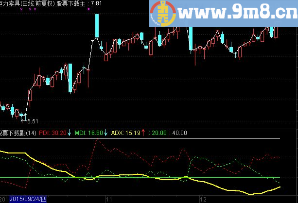 ADX:SMA(ABS(MDI-PDI)/(MDI+PDI)*100,N,1),COLORYELLOW,LINETHICK2;