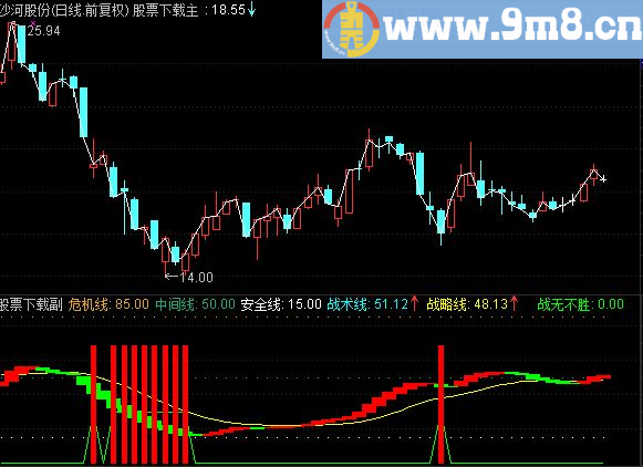 战无不胜: IF(VAR6 -12,30,0),LINETHICK1,COLORGREEN; 逢低介入: STICKLINE(VAR6 =-12,68,0,1,0), , COLORRED;
