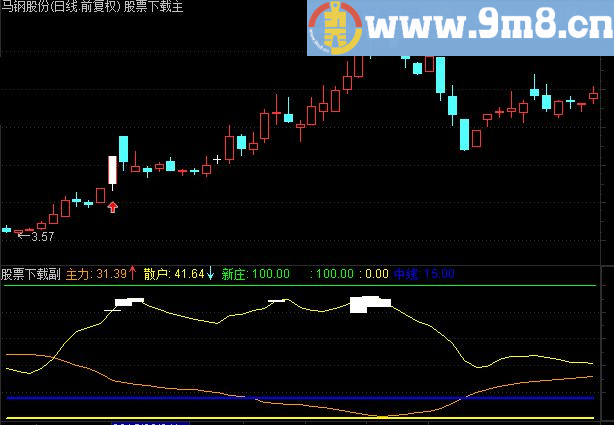 VAR1:=1; VAR2:=1/WINNER(CLOSE); VAR3:=MA(CLOSE,13); VAR4:=100-ABS((CLOSE-VAR3)/VAR3*100); VAR5:=LLV(LOW,75); VAR6:=HHV(HIGH,75); VAR7:=(VAR6-VAR5)/100; VAR8:=SMA((CLOSE-VAR5)/VAR7,20,1); VAR9:=SMA((OPEN-VAR5)/VAR7,20,1); VARA:=3*VAR8-2*SMA(VAR8,15,1); VARB:=3*VAR9-2*SMA(VAR9,15,1); VARC:=100-VARB; 主力: (100-VARA)*VAR1,COLOR0099FF; 散户: MA(WINNER(CLOSE*0.95)*100,3)*VAR1,COLORYELLOW; 新庄: (100-IF(VAR2 5,IF(VAR2 100,VAR2,VAR4-10),0))*VAR1,COLORGREEN,LINETHICK1,POINTDOT ; VARD:=散户 VAR4; VARE:=REF(LOW,1)*0.9; VARF:=LOW*0.9; VAR10:=(VARF*VOL+VARE*(CAPITAL-VOL))/CAPITAL; VAR11:=EMA(VAR10,30); VAR12:=CLOSE-REF(CLOSE,1); VAR13:=MAX(VAR12,0); VAR14:=ABS(VAR12); VAR15:=SMA(VAR13,7,1)/SMA(VAR14,7,1)*100; VAR16:=SMA(VAR13,13,1)/SMA(VAR14,13,1)*100; VAR17:=BARSCOUNT(CLOSE); VAR18:=SMA(MAX(VAR12,0),6,1)/SMA(ABS(VAR12),6,1)*100; VAR19:=(-200)*(HHV(HIGH,60)-CLOSE)/(HHV(HIGH,60)-LLV(LOW,60))+100; VAR1A:=(CLOSE-LLV(LOW,15))/(HHV(HIGH,15)-LLV(LOW,15))*100; VAR1B:=SMA((SMA(VAR1A,4,1)-50)*2,3,1); VAR1C:=(INDEXC-LLV(INDEXL,14))/(HHV(INDEXH,14)-LLV(INDEXL,14))*100; VAR1D:=SMA(VAR1C,4,1); VAR1E:=SMA(VAR1D,3,1); VAR1F:=(HHV(HIGH,30)-CLOSE)/CLOSE*100; VAR20:=VAR18 =25 AND VAR19 -95 AND VAR1F 20 AND VAR1B -30 AND VAR1E 30 AND VAR11-CLOSE =-0.25 AND VAR15 22 AND VAR16 28 AND VAR17 STICKLINE(VARD,VAR4,散户,5,0),COLORWHITE; STICKLINE(1,新庄,100,1,0),COLORGREEN; STICKLINE(VAR20,0,80,5,0),COLORRED,LINETHICK3 ; 100,COLORGREEN ,LINETHICK2 ; 0,COLORYELLOW ,LINETHICK2 ; 中线: 15,COLORBLUE ,LINETHICK2 ;
