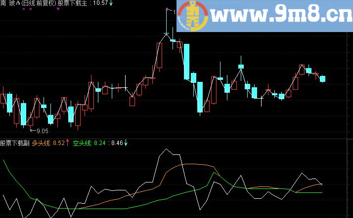 多头线:(SUM((((2)*(CLOSE-CLOSE*0.2)+(OPEN-OPEN*0.2)+(HIGH-HIGH*0.2)+(LOW-LOW*0.2))/(5))*(VOL),8))/(SUM(VOL,8)),COLOR0099FF,LINETHICK1; 空头线:LLV(多头线,8),LINETHICK1,COLORGREEN; C-C*0.2,COLORWHITE,LINETHICK1;