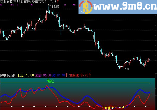DRAWTEXT(CROSS(80,决策线),100,'减仓'),COLOR00FF00;