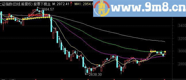 M1:=10;M2:=30;M3:=60;M4:=120; M:EXPMA(C,3); MA1:EXPMA(CLOSE,M1); MA2:EXPMA(CLOSE,M2); MA3:EXPMA(CLOSE,M3); MA4:EXPMA(CLOSE,M4); MX:IFF(MA3 REF(MA3,1),MA3,DRAWNULL),COLORYELLOW,CIRCLEDOT; MM:IFF(MA4 REF(MA4,1),MA4,DRAWNULL),COLORRED,CIRCLEDOT;