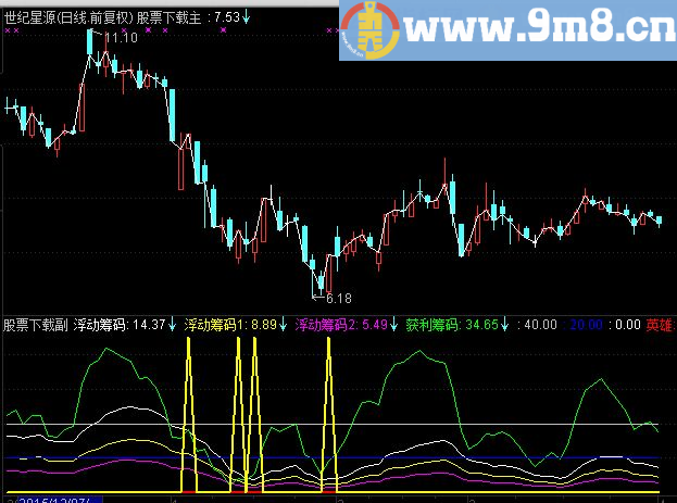VAR1:=(CLOSE-LLV(LOW,13))/(HHV(HIGH,13)-LLV(LOW,13))*100; VAR2:=(CLOSE-LLV(LOW,9))/(HHV(HIGH,9)-LLV(LOW,9))*100; VAR3:=(SMA(VAR2,3,1)-18)*1.55; VAR4:=SMA(VAR3,3,1); VAR5:=(CLOSE-LLV(LOW,100))/(HHV(HIGH,100)-LLV(LOW,100))*100; VAR6:=SMA(VAR5,10,1); VAR7:=(EMA(SMA(VAR6,8,1),34)-25)*2.6; VAR8:=POW(MA(CLOSE,5),2)+MA(CLOSE,5); VAR9:=POW(MA(LOW,5),2)+MA(LOW,5); VARA:=POW(MA(HIGH,5),2)+MA(HIGH,5); VARB:=((VAR8-LLV(VAR9,64))/(HHV(VARA,64)-LLV(VAR9,64))*150+65-10)/2; VARC:=SMA(VARB,3,1)*1.5-46; VARD:=SMA(VARC,3,1); VARE:=3*VARC-2*VARD; VARF:=(VAR1+VAR2+VAR5)/3; VAR10:=((VAR3+VAR3+VAR6+VARC)/4-15)*1.67; VAR11:=((VAR4+VAR4+VAR7+VARD)/4-15)*1.67; VAR12:=((VAR1+VAR5*2+VARF+VAR10+VAR11+VARB+VARC+VARD+VARE)/10-15)*1.67; VAR13:=(HHV(HIGH,5)-CLOSE)/(HHV(HIGH,5)-LLV(LOW,5))*(-1)+0.9; VAR14:=(HHV(HIGH,10)-CLOSE)/(HHV(HIGH,10)-LLV(LOW,10))*(-1)+0.92; VAR15:=(HHV(HIGH,15)-CLOSE)/(HHV(HIGH,15)-LLV(LOW,15))*(-1)+0.93; VAR16:=(HHV(HIGH,55)-CLOSE)/(HHV(HIGH,55)-LLV(LOW,55))*(-1)+0.94; VAR17:=(HHV(HIGH,89)-CLOSE)/(HHV(HIGH,89)-LLV(LOW,89))*(-1)+0.95; VAR18:=(HHV(HIGH,120)-CLOSE)/(HHV(HIGH,120)-LLV(LOW,120))*(-1)+0.91; VAR19:=(HHV(HIGH,180)-CLOSE)/(HHV(HIGH,180)-LLV(LOW,180))*(-1)+0.96; VAR1A:=((VAR13*8+VAR14*8+VAR15*8+VAR16+VAR17+VAR18+VAR19)/28-0.1)*185; VAR1B:=SMA(VAR1A,3,1); VAR1C:=(SMA(VAR1B,8,1)-8)*1.18; 浮动筹码: (VAR10+VAR11+VAR12+VARC+VARD+VARE+VAR1C+VAR7)/13 ; 浮动筹码1: (VAR10+VAR11+VAR12+VARC+VARD+VARE+VAR1C+VAR7)/21 ; 浮动筹码2: (VAR10+VAR11+VAR12+VARC+VARD+VARE+VAR1C+VAR7)/34; 获利筹码: (VAR3+VAR6+VAR1B*2)/4 ; 40; 20; 0; VARA1:=(CLOSE-LLV(LOW,60.13547854))/(HHV(HIGH,60.13547854)-LLV(LOW,60))*80; VARB1:=SMA(VARA1,7,1); VARC1:=SMA(VARB1,5,1); 英雄:IF(CROSS(VARB,VARC) AND VARB 20,100,0),LINETHICK2,COLORRED; VAR2N:=LLV(LOW,3) =LLV(LOW,60); VAR3N:= C O AND (C/O 1.03 OR C 1.03*REF(C,1)); 绝地反击:IF(VAR2N AND VAR3N,90,0),COLORYELLOW,LINETHICK2;