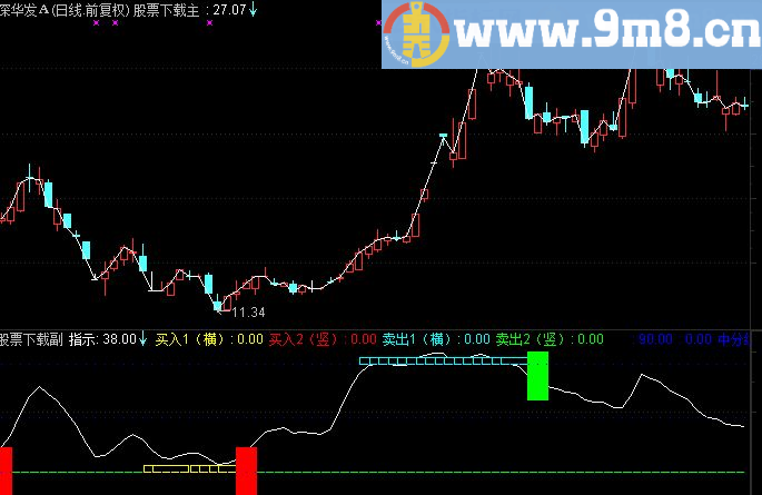 VAR1:=(EMA(CLOSE,12)-EMA(CLOSE,26))*100+50; VAR2:=EMA(VAR1,9); VAR3:=(HHV(HIGH,21)-CLOSE)/(HHV(HIGH,21)-LLV(LOW,21))*100-10; VAR4:=(CLOSE-LLV(LOW,21))/(HHV(HIGH,21)-LLV(LOW,21))*100; VAR5:=SMA(VAR4,13,8); 指示: CEILING(SMA(VAR5,13,8)); VAR6:=SMA(VAR3,21,8); 买入1(横):0, COLORYELLOW; 买入2(竖):0, COLORRED; 卖出1(横):0,COLORCYAN; 卖出2(竖):0, COLORGREEN; STICKLINE(指示-VAR6 -65,0,5,15,1), COLORYELLOW; STICKLINE(LONGCROSS(VAR1,VAR2*1.05,15) AND VAR1 40,20,-20,8,0), COLORRED; STICKLINE(指示-VAR6 85,95,90,15,1),COLORCYAN; STICKLINE(LONGCROSS(VAR2,VAR1*0.95,7) AND VAR1 60,100,60,8,0), COLORGREEN; 90, POINTDOT; 0, POINTDOT; 中分线: 45, POINTDOT;