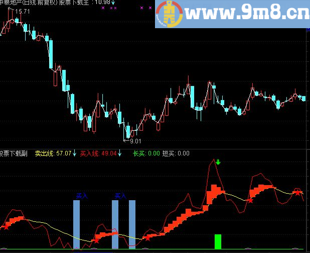 N:=2;M:=3; VAR2:=1; VAR3:=REF(HIGH,1)*1.1; VAR4:=HIGH*1.1; VAR5:=(VAR4*VOL+VAR3*(CAPITAL-VOL))/CAPITAL; VAR6:=REF(LOW,1)*0.9; VAR7:=LOW*0.9; VAR8:=(VAR7*VOL+VAR6*(CAPITAL-VOL))/CAPITAL; VAR9:=EMA(VAR8,30); VARA:=EMA(VAR5,30); VARB:=VARA-2; VARC:=IF(CLOSE =VAR9,VARB,VARA); VARD:=MA(CLOSE,80)-MA(CLOSE,10)/17; 出手: STICKLINE(VARC-VARB=0 AND VAR2 AND CROSS((EMA(EMA(EMA(CLOSE,N),N),N)-REF(EMA(EMA(EMA(CLOSE,N),N),N),1))/REF(EMA(EMA(EMA(CLOSE,N),N),N),1)*100,MA((EMA(EMA(EMA(CLOSE,N),N),N)-REF(EMA(EMA(EMA(CLOSE,N),N),N),1))/REF(EMA(EMA(EMA(CLOSE,N),N),N),1)*100,M)),50,0,5,0),COLORCC9966; 赢: DRAWTEXT(FILTER(VARC-VARB=0 AND CROSS((EMA(EMA(EMA(CLOSE,N),N),N)-REF(EMA(EMA(EMA(CLOSE,N),N),N),1))/REF(EMA(EMA(EMA(CLOSE,N),N),N),1)*100,MA((EMA(EMA(EMA(CLOSE,N),N),N)-REF(EMA(EMA(EMA(CLOSE,N),N),N),1))/REF(EMA(EMA(EMA(CLOSE,N),N),N),1)*100,M)),4),55,'买入'),COLORBLUE , ; VARE:=(CLOSE-LLV(LOW,34))/(HHV(HIGH,34)-LLV(LOW,34))*100; 卖出线: SMA(SMA(VARE,3,1),3,1),COLORYELLOW , ; 买入线: 3*SMA(VARE,3,1)-2*卖出线,COLORRED , ; DRAWICON(CROSS(90,买入线),90,2); 顶: STICKLINE(CROSS(90,买入线),15,0,5,0),COLORGREEN ,; 黄金点: STICKLINE(SMA(VARE,3,1) 卖出线,SMA(VARE,3,1),卖出线,4,0),COLOR1133FF; 长买: FILTER(VARC-VARB=0 AND CROSS((EMA(EMA(EMA(CLOSE,N),N),N) -REF(EMA(EMA(EMA(CLOSE,N),N),N),1))/REF(EMA(EMA(EMA(CLOSE,N),N),N),1) *100, MA((EMA(EMA(EMA(CLOSE,N),N),N)-REF(EMA(EMA(EMA(CLOSE,N),N),N),1)) /REF(EMA(EMA(EMA(CLOSE,N),N),N),1)*100,M)),4) ; 短买: CROSS(买入线,卖出线); DRAWTEXT(短买,卖出线,'★'),COLORRED;