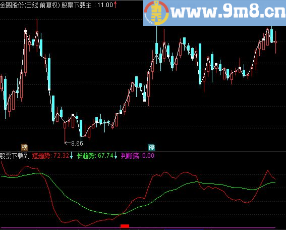底部:STICKLINE(短趋势 10 AND 判断底 0,0,5,6,1);