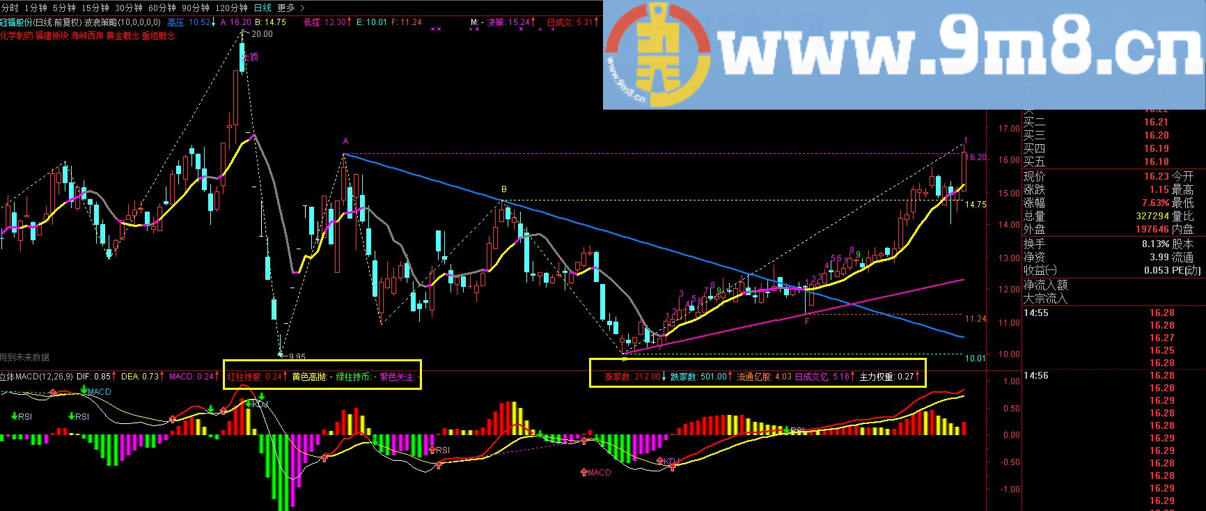 立体MCAD指标,有顶底背离,KDJ,RSI。。。,有持股、投币提醒、有大盘涨跌家数、有流通盘、日成交额。。。