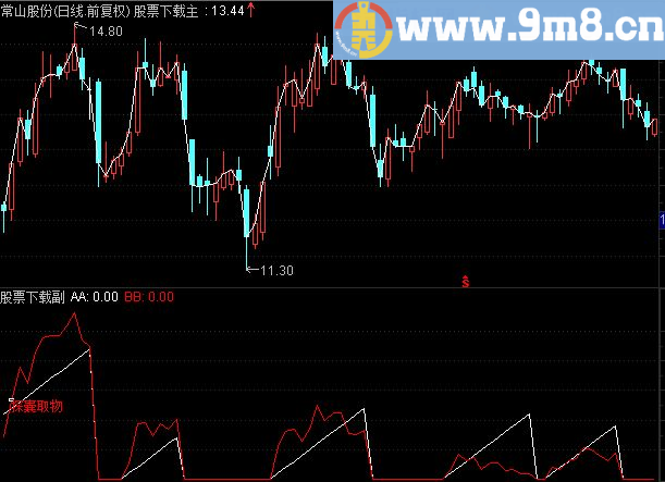 BB:(C-REF(C,AA))/REF(C,AA)*100,COLORRED; STICKLINE(CROSS(BB,10) AND C/REF(C,1) 1.05,BB,BB+0.5,2,1),COLORWHITE; DRAWTEXT(CROSS(BB,10) AND C/REF(C,1) 1.05,BB*0.93,'探囊取物'),COLORRED;