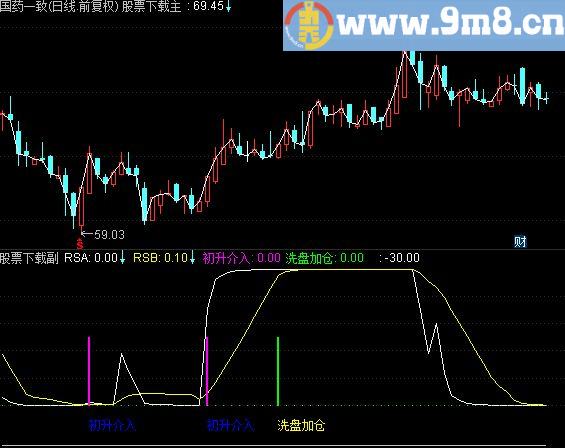 初升介入:IF(CROSS(RSA,RSB),50,0),STICK,LINETHICK2;