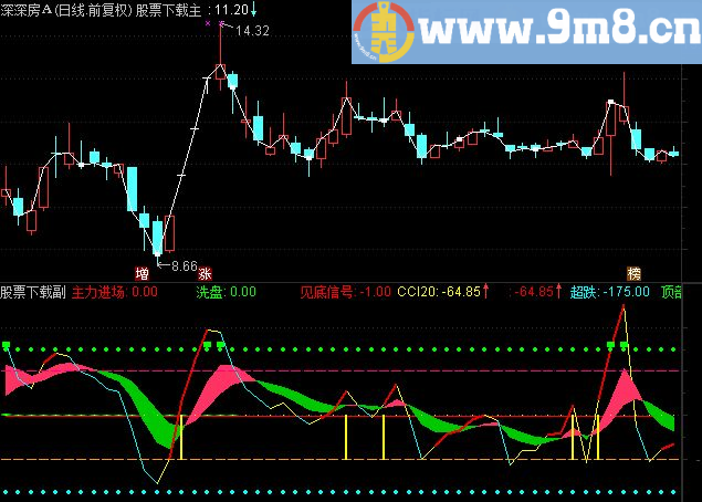 抄底:IF(CROSS(CCI20,反弹买入),-100,0),STICK,COLORYELLOW,LINETHICK2;