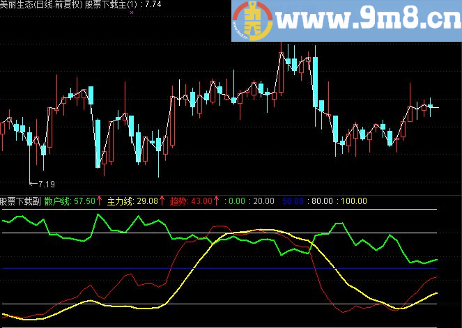 散户线: 100*(HHV(HIGH,60)-CLOSE)/(HHV(HIGH,60)-LLV(LOW,60)),LINETHICK2,COLOR00FF00;