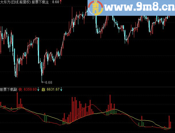 STICKLINE((量-快) 0,量,快,0.05,-1),COLORGREEN;