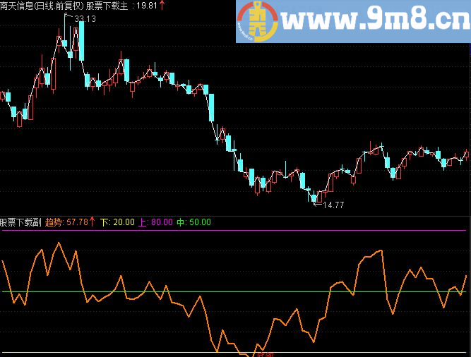 中:50; DRAWTEXT(CROSS(80,趋势),80,'顶部'),COLORGREEN;