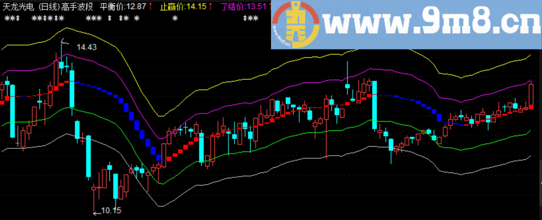 波段高手是波段操作的看盘利器,通道中间为多空盈亏平衡的价格,平衡价红色表示股价处于上涨趋势当中,平衡价蓝色表示股价处于下跌趋势之中,多空趋势一目了然。