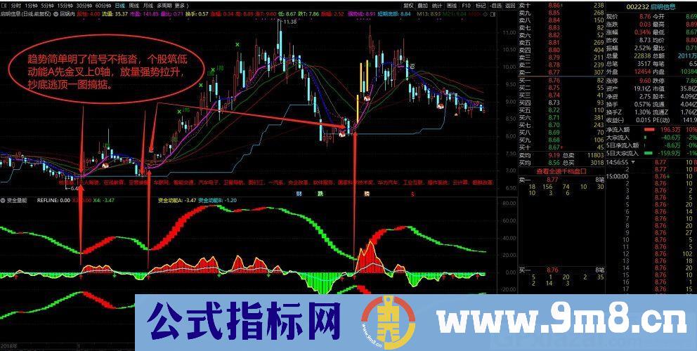 4、该指标主要是从成交量和资金方面来辅助大家判断一只个股的涨跌。指标使用比较简单,大家对照着我们的案例图进行学习操作,可以说抄底逃顶,一个指标便搞定。