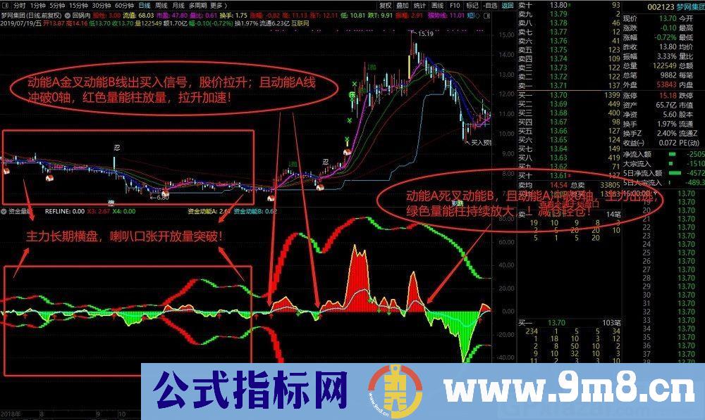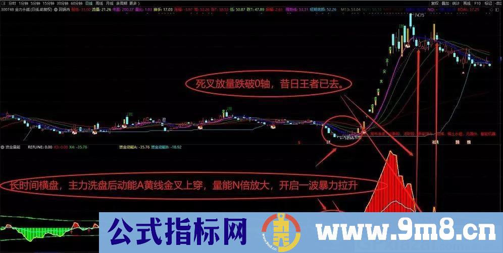 1、如图所示,指标中包含资金动能A黄色曲线和资金动能B浅蓝色曲线,动能A金叉动能B线出买入信号,股价拉升;且动能A线冲破0轴,红色量能柱放量,拉升加速。