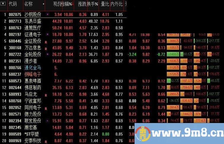 {追涨选股-可预警} 波长:=3; 波背:=-0.8; 外内比:=0.9; 开盘涨:=0.005; 攻击波:=(C-L)/L*100>=波长 ; 回头波:=(C-H)/H*100>=波背; 开盘涨幅:=(O-REF(C,1))/REF(C,1)*100>=开盘涨; 外内比1:= 1/DYNAINFO(51)>=外内比; XG:攻击波 AND 回头波 AND 开盘涨幅 AND 外内比1;