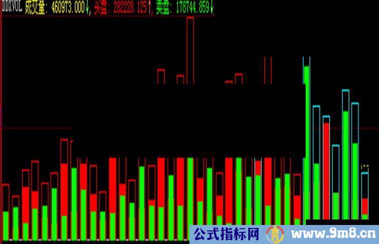 说明:红空心柱-上升趋势成交量,蓝空心柱-下跌趋势成交量,红心柱-买量,绿心柱-卖量,黄空心柱-虚拟成交量。