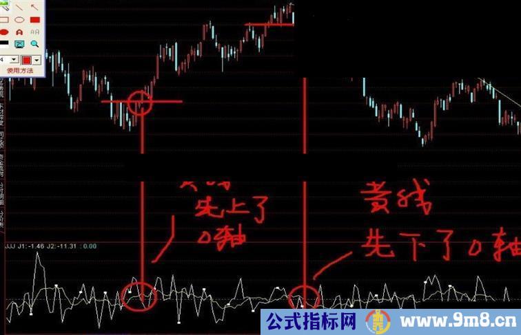 AA:=(CLOSE-REF(CLOSE,20)); J1:((AA-REF(AA,2))/2); J2:((AA-REF(AA,10))/10); 0,POINTDOT,COLORFFFF00,LINETHICK3;