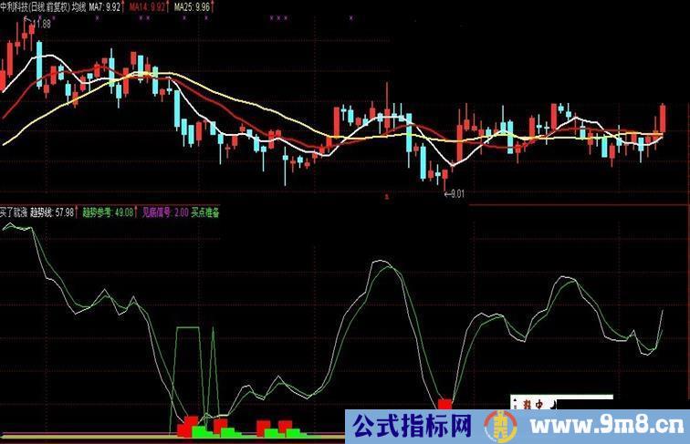 2. 等白色和绿色趋势线数值降到20以下,白色趋势线上穿绿色趋势线,形成金叉后考虑买进。