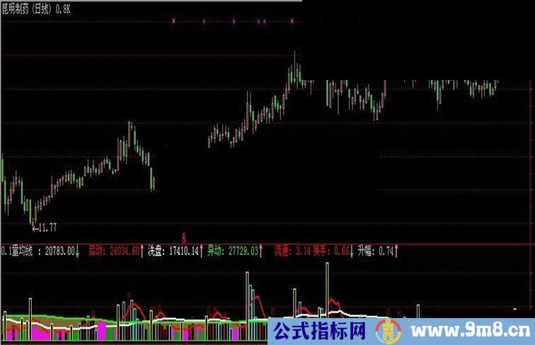 STICKLINE(C>=REF(C,1) AND 启动<异动 AND V<启动,VOL,0,2.5,0),COLORFF00FF;
