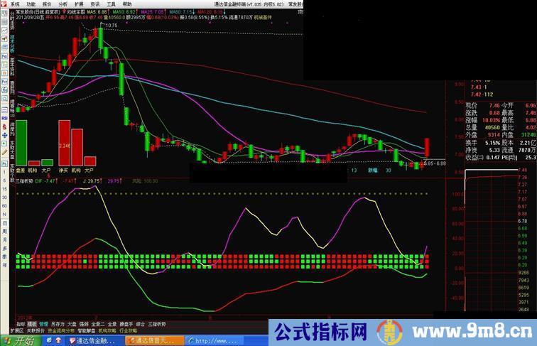 指标中的三排色条,从上到下依次表示5日均线,J线和DIFF线的状态,色块为红表示相应指标为上升状态,为绿色则为下降状态.