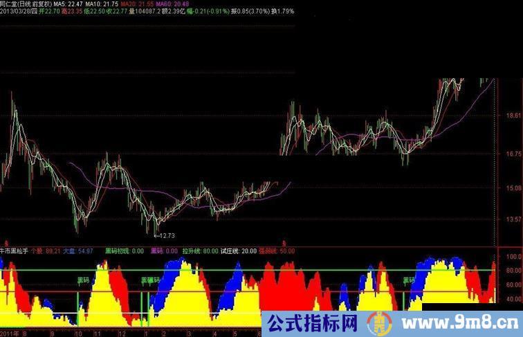 黑码初现:IF(CROSS(个股,9),50,0),STICK,LINETHICK3,COLOR00FF00;