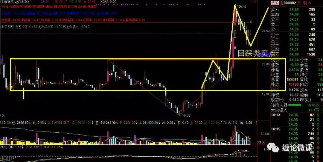 从概率角度来将,第一次回踩买点风险是最低的,完后回踩的机会越多,风险越大,但是没去万科A二次回踩虽然到位置,但是没有出现底分型,持续底分型才算买点,如果明天收一根大阳线就会形成买点,明天就可以买,止损位设置在今天的最低点22.95元附近。