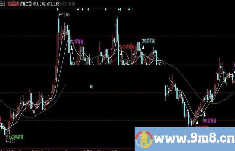DRAWTEXT(FILTER(D4>0,5),HIGH*1.04,'DMI顶背离'),COLORF0F000;