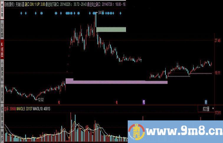 公式在顶行显示向下(DN)和向上缺口(UP)的总数,以及(离当前光标)最近的向下/向上缺口的日期和缺口上下沿。