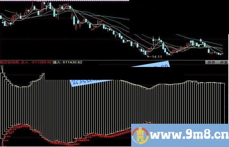 成交价总和:=外盘+内盘; X:=SUM(成交价总和,22)/22-LLV(C,1); 点火:C-X,colorred; 熄火:C+X,coloryellow; DRAWTEXT(点火/熄火<1.1 AND 点火/熄火>-5,点火*1.01,'***'),colorred; STICKLINE(点火/熄火<1.1 AND 点火/熄火>-5,点火,熄火,25,1),coloryellow;