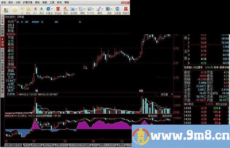 获利比例:也就是筹码K线的收盘价。获利比例大于80%以上时肯定是要套现的。特别是筹码K线在高位长时间大量堆积时。