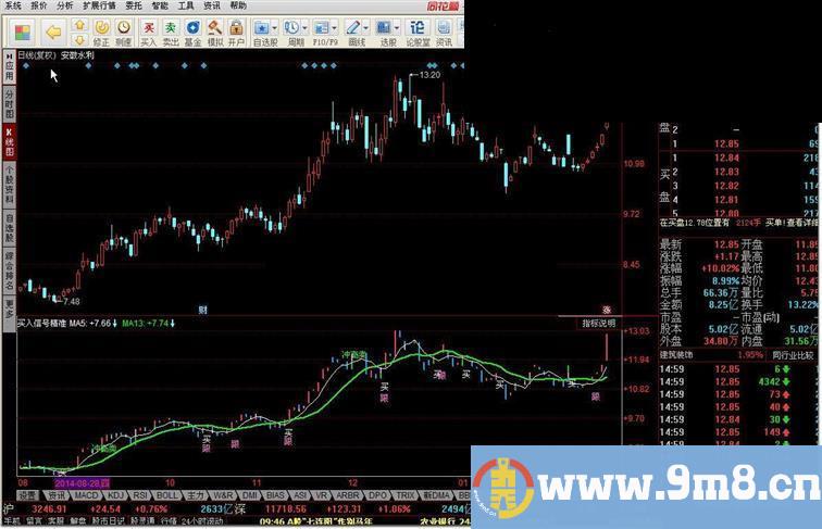 VAR3:=REF(C,1)=LLV(C,4) AND C>=REF(C,2) OR REF(C,2)=LLV(C,4) AND REF(C,1)<=REF(C,3) AND REF(C,2)=REF(C,1); A:=(3*C+L+O+H)/6; VAR4:=(20*A+19*REF(A,1)+18*REF(A,2)+17*REF(A,3)+16*REF(A,4)+15*REF(A,5)+ 14*REF(A,6)+13*REF(A,7)+12*REF(A,8)+11*REF(A,9)+10*REF(A,10)+9*REF(A,11)+8*REF(A,12) +7*REF(A,13)+6*REF(A,14)+5*REF(A,15)+4*REF(A,16)+3*REF(A,17)+2*REF(A,18)+REF(A,20))/210; MTM:=C-REF(C,1); DX:=100*EMA(EMA(MTM,6),6)/EMA(EMA(ABS(MTM),6),6); CB:=EMA(VAR4,13); STICKLINE(CLOSE>=OPEN,CLOSE,OPEN,3,0),COLOR0000FF; STICKLINE(CLOSE>=OPEN,CLOSE,OPEN,0.5,0),COLORCC66FF; STICKLINE(CLOSE STICKLINE(CLOSE STICKLINE(VAR1,C,(O+C)/2,3,0),COLORFF11FF; STICKLINE(VAR1,C,(O+C)/2,0.5,0),COLORFFDDFF; STICKLINE(VAR2,C,(O+C)/2,3,0),COLOR999999; STICKLINE(VAR2,C,(O+C)/2,0.5,0),COLORFFBBFF; STICKLINE(VAR3,O,(O+C)/2,3,0),COLOR00BB00; STICKLINE(VAR3,O,(O+C)/2,0.5,0),COLOR00FF00; 卖:=HHV(DX,2)=HHV(DX,7) AND COUNT(DX>50,2) AND CROSS(MA(DX,2),DX); DRAWTEXT(FILTER(卖=1,1),HIGH*1.02,'冲高卖'),colorgreen; 买:=LLV(DX,2)=LLV(DX,7) AND COUNT(DX<0,2) AND CROSS(DX,MA(DX,2)); DRAWTEXT(FILTER(买=1,5),LOW-0.03,'买'),colorwhite; 加仓:=SMA(EMA((C-REF(C,1))/REF(C,1),5)*100,3,1)*10; DRAWTEXT(FILTER((CROSS(加仓,0) OR CROSS(CLOSE,CB)) AND 买=1,3),LOW-0.03,''),colorwhite; 跟:=MA18>=REF(MA18,3) AND CROSS(CLOSE,MA18); DRAWTEXT(跟,LOW*0.96,'跟'),COLORCC66FF;