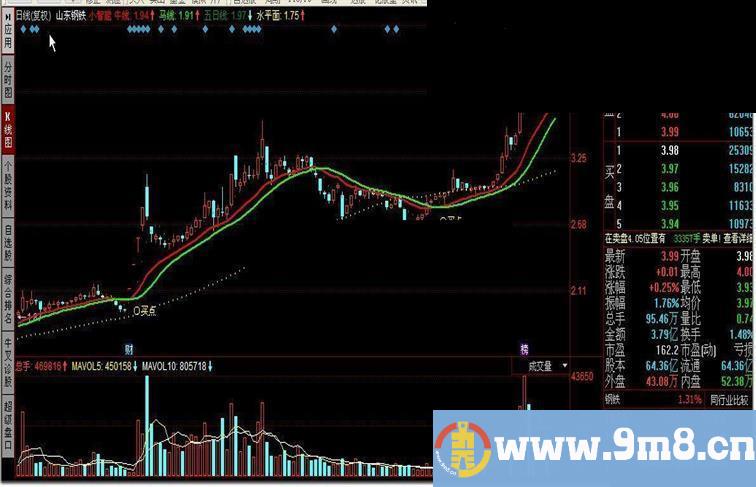 DRAWTEXT(CROSS(牛线,马线) AND MA(C,1)-牛线<2,马线*0.972,'○买点'),coloryellow;