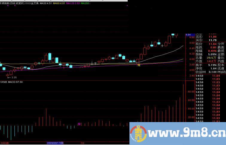 DRAWTEXT(CROSS(J,REF(J+0.01,1)) AND X AND J<20 AND MACD>0,B*1.05,'短'),COLORFF00FF;