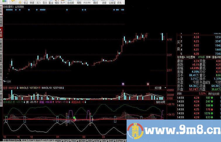 骤雨初晴:=ABS(EMA(I,13.3)-18)/WINNER(CLOSE)*IF((CLOSE-MA(CLOSE,6))/MA(CLOSE,6)<-0.04,1,0); W:=COST(10)*0; DIFF:=EMA(CLOSE,12) - EMA(CLOSE,26),colorred; DEA:=EMA(DIFF,9),coloryellow; MACD:=2*(DIFF-DEA)*231,STICK,colorred,LINETHICK1; STICKLINE(MACD0,0,MACD,0.9,0),COLOR00FFFF; STICKLINE(MACD<=REF(MACD,1)AND MACD<0,0,MACD,0.8,0 ),COLORFFEE44; STICKLINE(MACD>=REF(MACD,1)AND MACD>0,0,MACD,1.1,0 ),COLOR0055FF; STICKLINE(MACD>REF(MACD,1)AND MACD<0,0,MACD,1.1,0 ),COLORFF55BB; DRAWTEXT(CROSS(绝佳买点,1.20000) ,-32,'疯牛'),coloryellow,LINETHICK2 ; DRAWTEXT(CROSS(绝佳买点,4.50000) ,63,'倾家荡产买'),COLOR00FFFF,LINETHICK2; {DRAWTEXT(CROSS(绝佳买点,7.00000) ,88,'疯牛3'),colorcyan,LINETHICK4;} DRAWTEXT(CROSS(绝佳买点,3.60000) ,28,'疯牛2'),COLORFF00FF,LINETHICK4; {DRAWTEXT(CROSS(绝佳买点,2.40000) ,-55,'疯牛1'),COLORFFFFCC,LINETHICK3 ; };