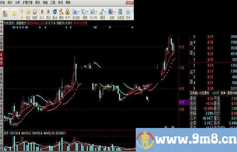 A:IF(CLOSE>SAR(N,S,M),SAR(N,S,M),DRAWNULL),CIRCLEDOT,colorred; B:IF(CLOSE DRAWKLINE(H,O,L,C); 均线10:EMA(C,10),coloryellow,LINETHICK2; 升10:IF(均线10>REF(均线10,1),均线10,DRAWNULL),colorred,LINETHICK2; 降10:IF(均线10