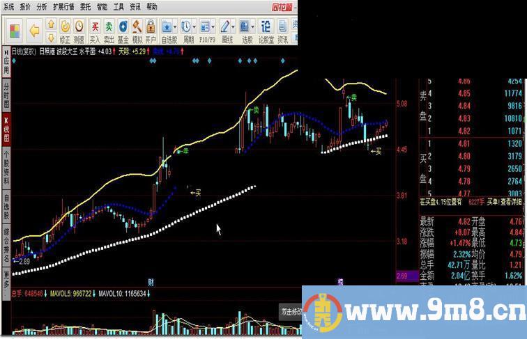 波段起始点:蓝线上穿黄线金叉,同时蓝线下方出现“买”字;波段行情终止点:股价触及天际线并发出“卖”字样,无需蓝线下穿黄线死叉。