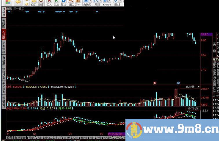 A:IF(CLOSE>SAR(N,S,M),SAR(N,S,M),DRAWNULL),CIRCLEDOT,colorred; B:IF(CLOSE DRAWKLINE(H,O,L,C); 均线10:EMA(C,10),coloryellow,LINETHICK2; 升10:IF(均线10>REF(均线10,1),均线10,DRAWNULL),colorred,LINETHICK2; 降10:IF(均线10