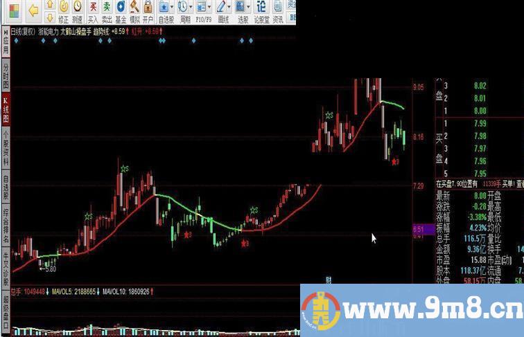 STICKLINE(行情线>=操盘线,C,O,2,1),colorred;