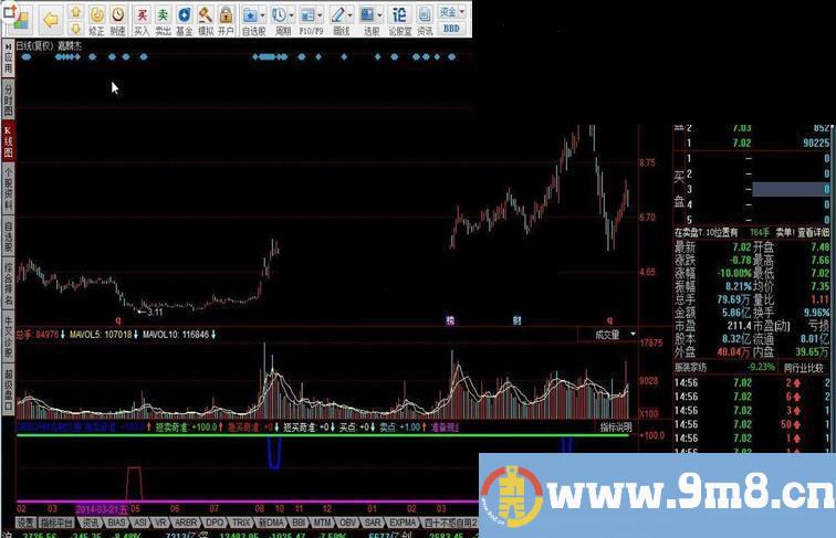 急买奇准:IF(LLV((高<买卖),8),50,0),colorred,LINETHICK1;