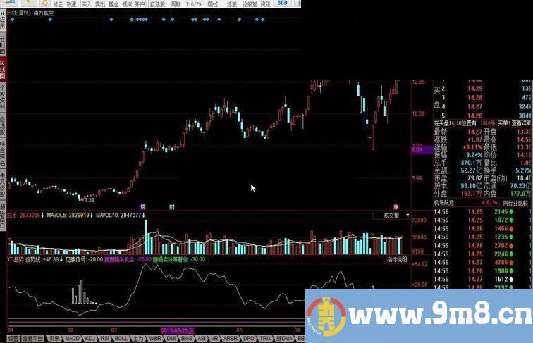 VAR2:=REF(LOW,1);VAR3:=SMA(ABS(LOW-VAR2),3,1)/SMA(MAX(LOW-VAR2,0),3,1)*100; VAR4:=EMA(IF(CLOSE*1.2,VAR3*10,VAR3/10),3); VAR5:=LLV(LOW,38); VAR6:=HHV(VAR4,38); VAR7:=IF(LLV(LOW,90),1,0); VAR8:=EMA(IF(LOW<=VAR5,(VAR4+VAR6*2)/2,0),3)/618*VAR7; 有庄的影子: STICKLINE(VAR8,0,VAR8,6,1) , colorlired;趋势线: (CLOSE-MA(CLOSE,40))/MA(CLOSE,40)*100 , COLORAABBDD;见底信号:-20,coloryellow; 莫要错失机会:-25,colormagenta;砸锅卖铁等着你:-30,colorgreen;