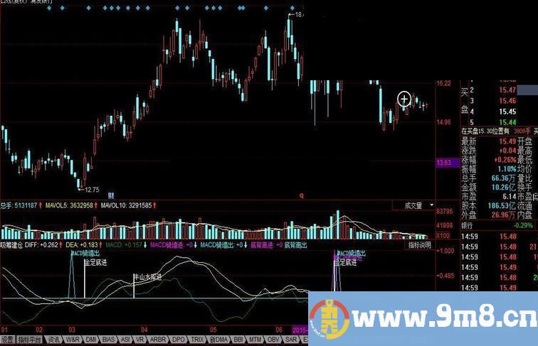 MACD骑墙进:DIFF>=0 AND CROSS(DIFF,dea) AND V/MA(V,5)>1.5,colormagenta;