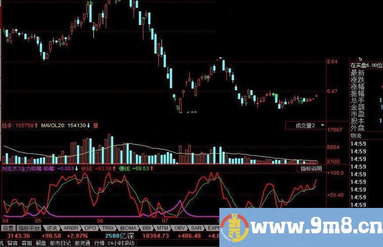 图解中红线与绿线分别是快线和慢线,粉色线是最主要的吸筹线。 一般当红线(快线)和绿线(慢线)出现交叉的时候,说明有振荡,并且是变向点,适用短周期5分钟到大周期日线分析比对,交叉跟踪。 当红线(快线)与粉线(吸筹线)交叉的时候,说明庄家有大资金进入,这是不要急于入场,等待绿线(慢线)与粉线(吸筹线)交叉的时候,这时是入场的好时机。 粉线(吸筹线)一般是平行在底部的,当他有波浪的时候,说明庄家有资金进入,波浪越大资金越大,吸筹越大。 建议:跟短线,查看5分钟到日线周期的变化趋势.