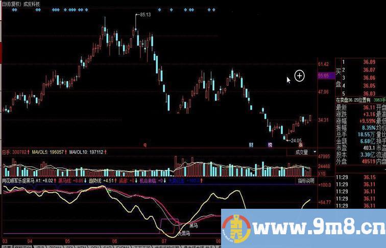大势已去:IF(CROSS(黑马线,A1)AND 黑马线>70 AND 趋势线>80,90,100),COLORFF0000