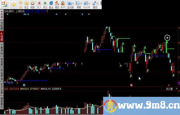 DRAWTEXT(VAR9,H*1.007,'九'),COLOR00FF00; DRAWTEXT(VAR10,L*0.993,'六'),COLOR00FFFF; VAR13:=ZIG(3,15.88)REF(ZIG(3,15.88),2); VAR14:=ZIG(3,15.88)>REF(ZIG(3,15.88),1) AND REF(ZIG(3,15.88),1)