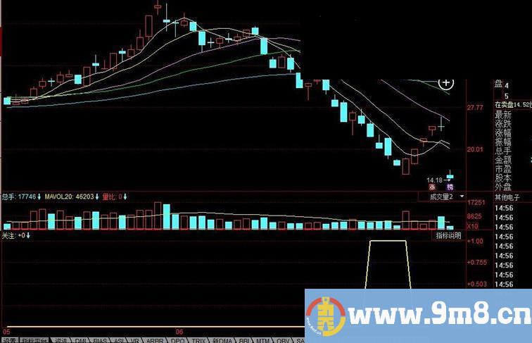 从容抄底,提前关注,值得收藏!大家可以验证一下 源码: N:=13; DMH:=SUM(IF(H>REF(H,1),H-REF(H,1),0),N); DML:=SUM(IF(L>REF(L,1),0,REF(L,1)-L),N); 量:=DMH/(DMH+DML),colorred; 关注:量<0.08,coloryellow,LINETHICK2;