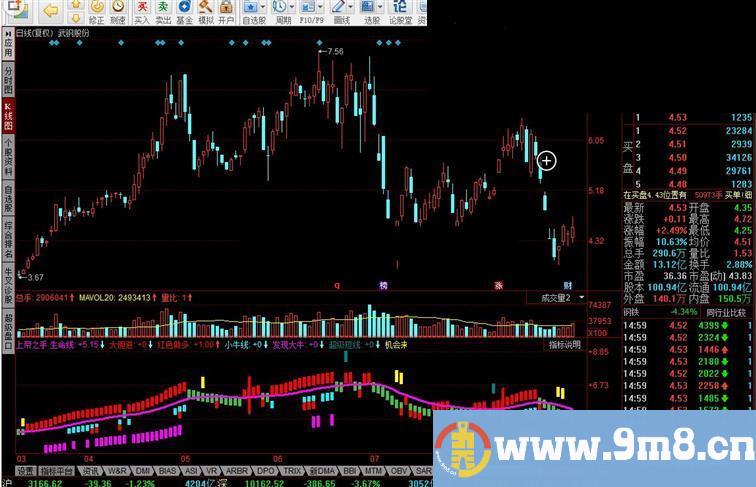 YX1:=BARSLASTCOUNT(CLOSE 操作线:=EMA(CLOSE,9); 生命:=EMA(操作线,3); 生命线:EMA(操作线,13),LINETHICK3,colormagenta; BBA:=(REF(ZF1,1)<-8 AND ZF1>ABS(REF(ZF1,1)/2) AND LLL>1.2); AB0:=(A>B AND NOT(REF(DD1,1) AND CLOSE AB:=(A>B AND NOT(REF(DD1,1) AND CLOSE STICKLINE(AB,生命,生命*1.08,5,0),LINETHICK4,colorred; STICKLINE(NOT(AB),生命,生命/1.08,5,0),LINETHICK4,colorligreen; AC:=CROSS(操作线,生命线) OR 操作线=生命线; STICKLINE(CLOSE>OPEN AND REF(AC,1),生命线/1.2,操作线*1.2,1,0),LINETHICK4,colorred; 大胆进:CLOSE>OPEN AND REF(AC,1),NODRAW,colorred; VAR1:=(C-MA(C,6))/MA(C,6)*100; VAR2:=MA(100*(C-LLV(C,34))/(HHV(H,34)-LLV(L,34)),5)-20; MACD:=EMA(EMA(VAR1,5),5)*6,NODRAW,colorwhite; VAR3:=MACD>0 AND MACD